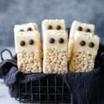 I keep leftover Rice Crispy Ghost Bars in an airtight container at room temperature for up to three days. Just be sure they’re out of direct sunlight and warm spots so that the white chocolate doesn’t soften or melt prematurely.
