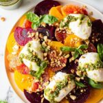 - Assemble the salad: On a serving platter, arrange slices of blood orange and cara cara orange. Carefully place the burrata balls on top. Arrange the beet wedges around the cheese, scatter the chopped pistachios over the salad, and drizzle generously with the basil oil. Sprinkle flaky sea salt and rip basil leaves over the top before serving.