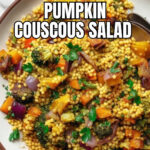 A vibrant and nutritious Roasted Pumpkin Couscous Salad featuring a medley of spiced roasted vegetables, pearl couscous, and plant-based ingredients, perfect to enjoy hot or cold as a wholesome main or side dish.