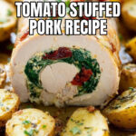 A flavorful stuffed pork tenderloin recipe filled with spinach, sun-dried tomatoes, and mozzarella cheese, roasted alongside seasoned potatoes for a complete and satisfying meal.