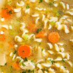 The trick is to cook your noodles separately, slightly undercooked, and add them to your portion when serving. If you mix the noodles into the soup and store it, they will soak up the broth and become mushy — not as delicious!